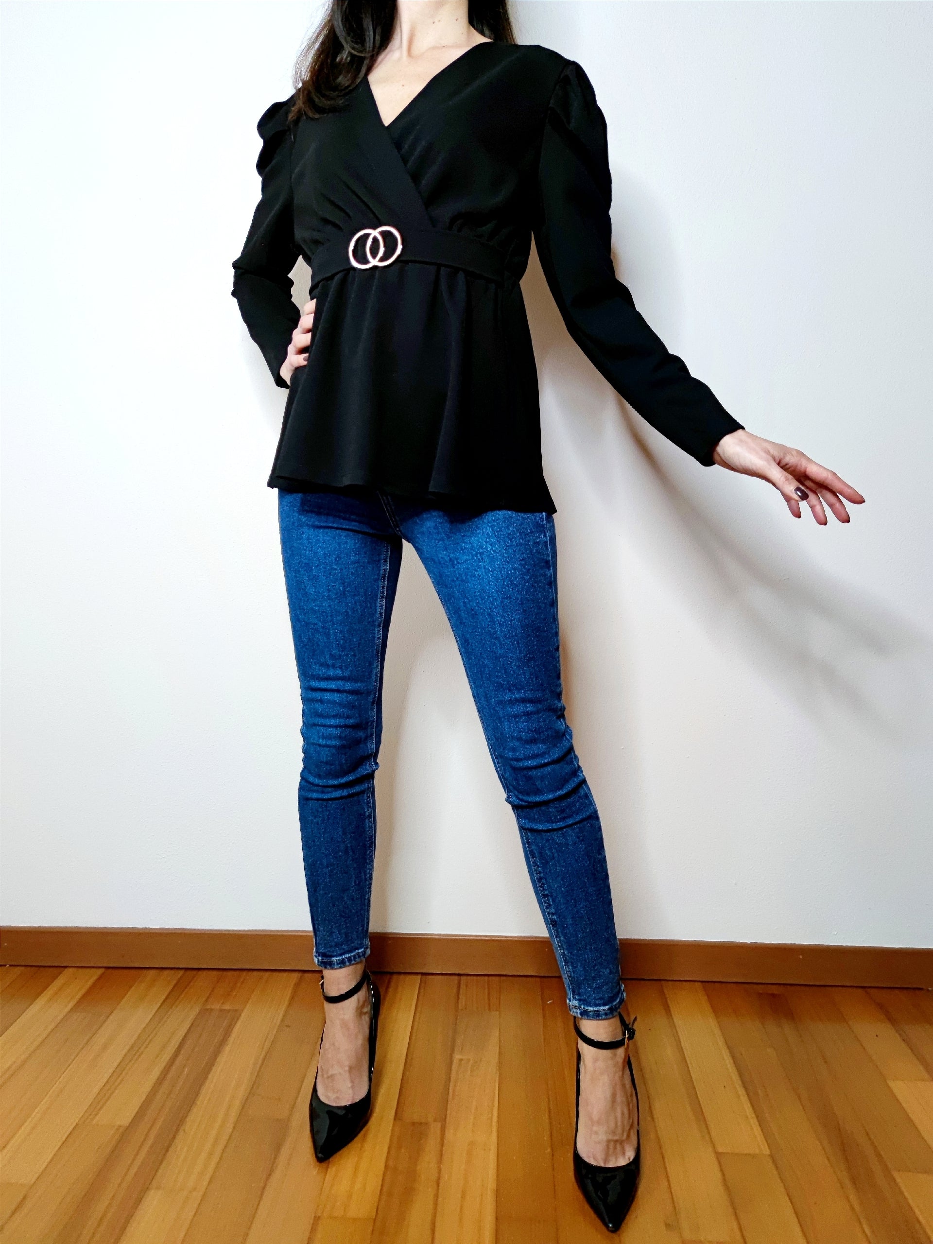 Blusa elegante nera con cintura ed elastico in vita, spalle a sbuffo