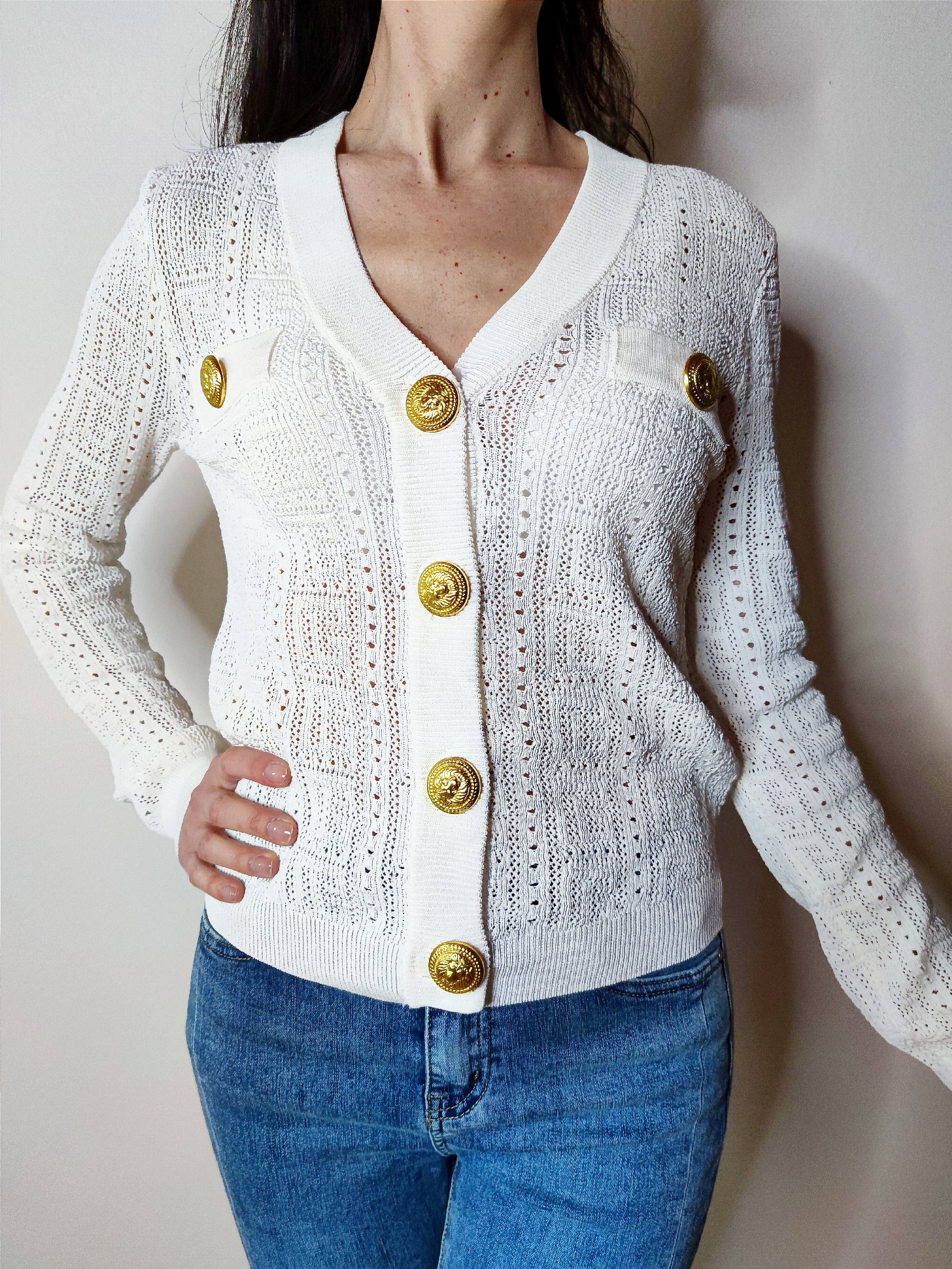 Cardigan elegante realizzato in tessuto tramato e leggermente traforato di qualità, presenta bottoni gioiello color oro e tasche applicate che donano un tocco di stile , ideale per look formali o casual