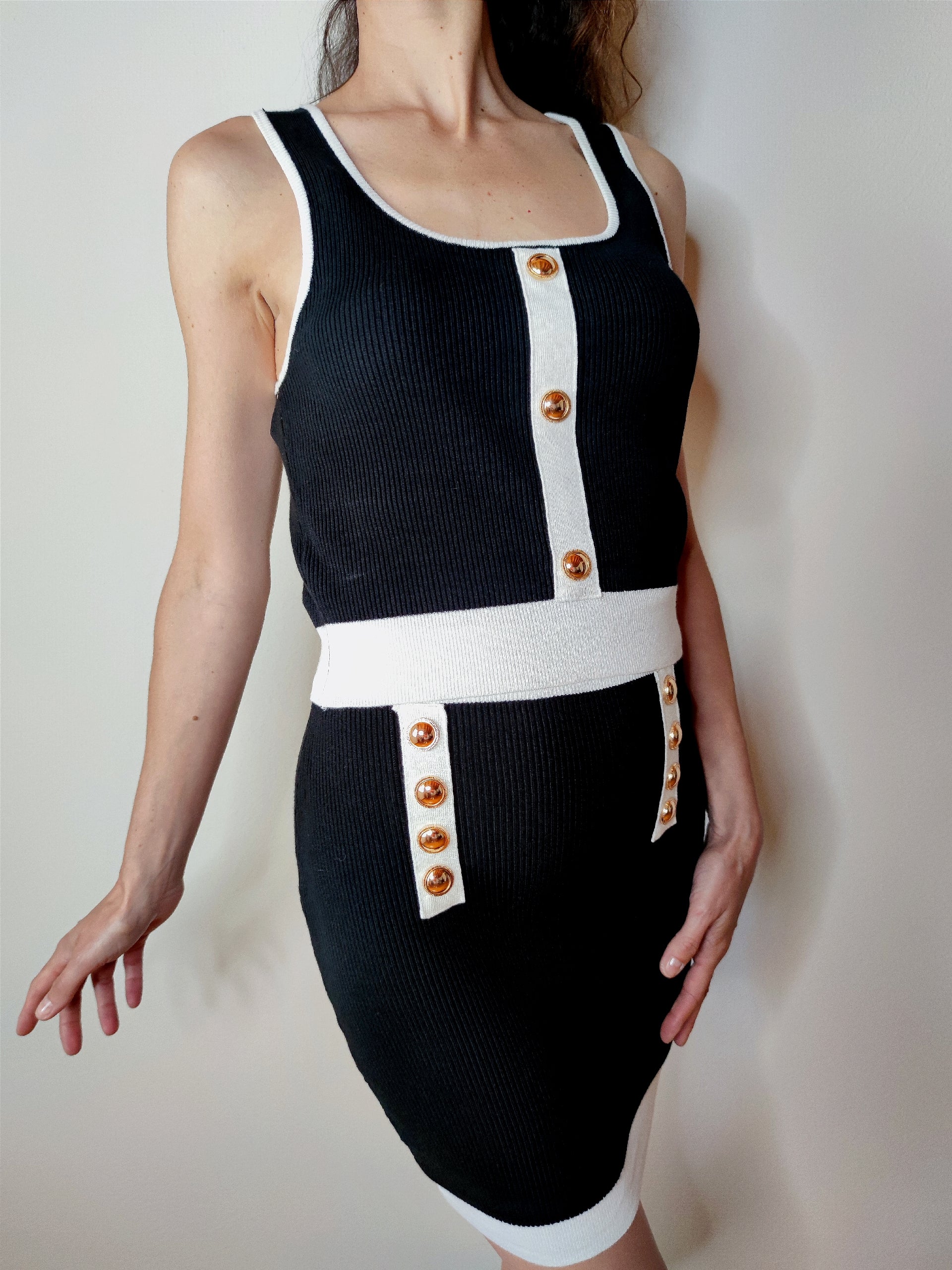 Coordinato realizzato in tessuto di qualità a costa sottile di viscosa, composto da canotta e minigonna, garantisce una vestibilità perfetta e un tocco di stile grazie ai bottoni dorati. Ideale per look raffinati, versatili e casual