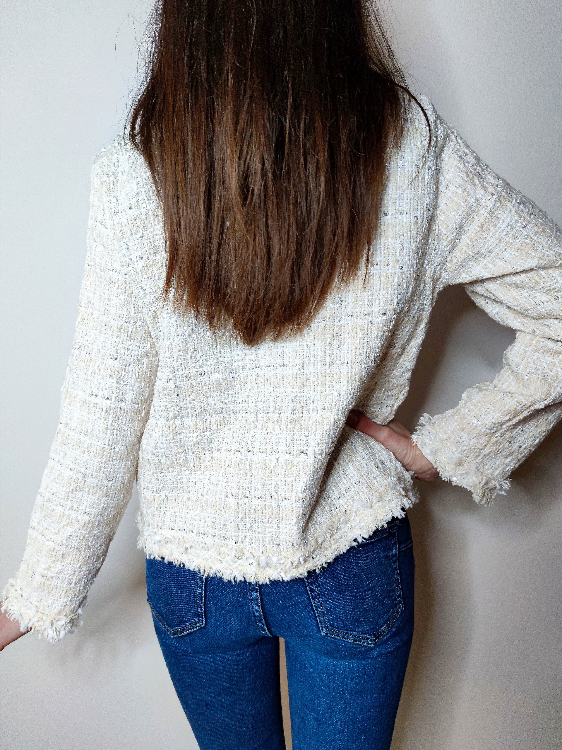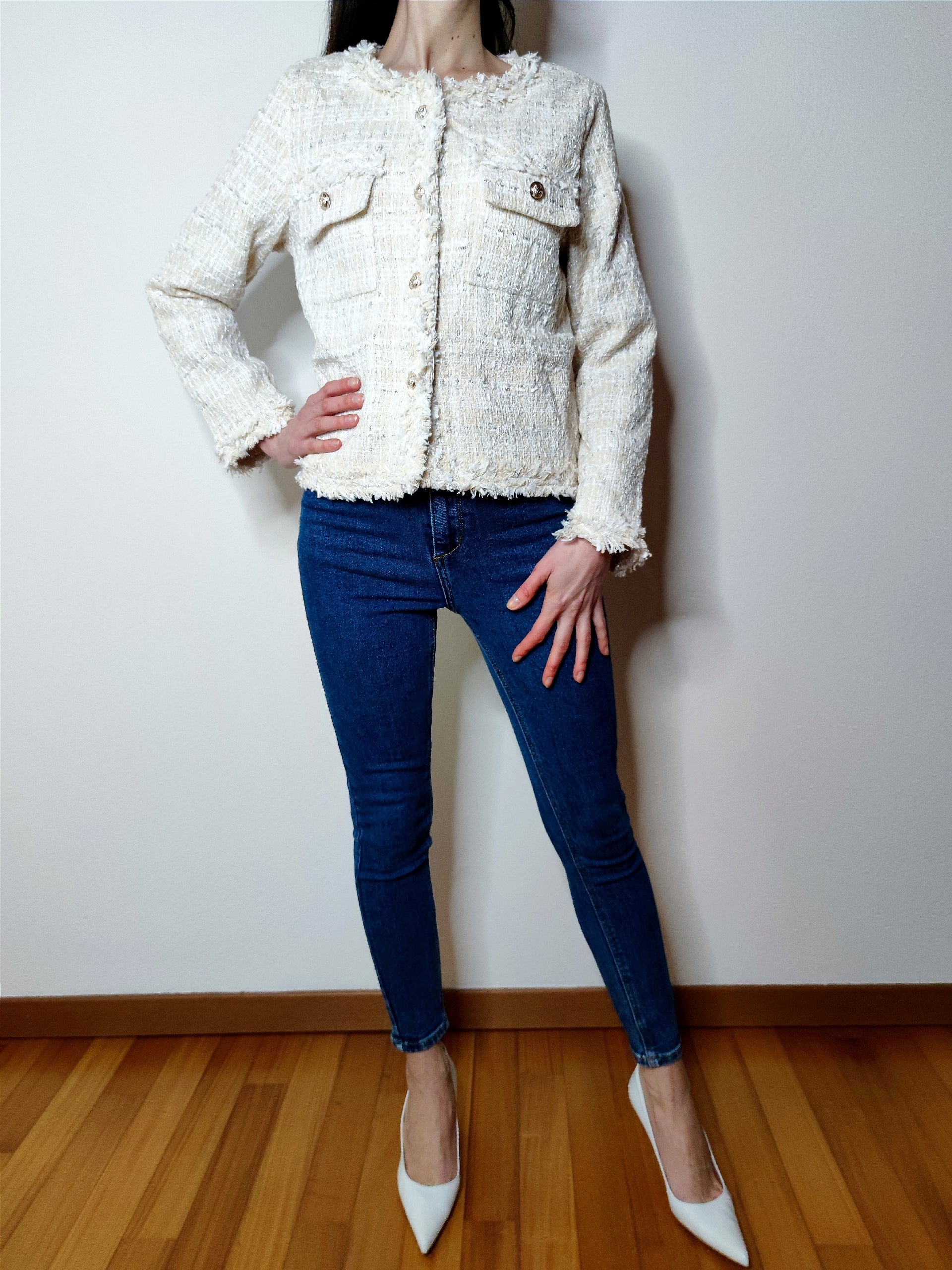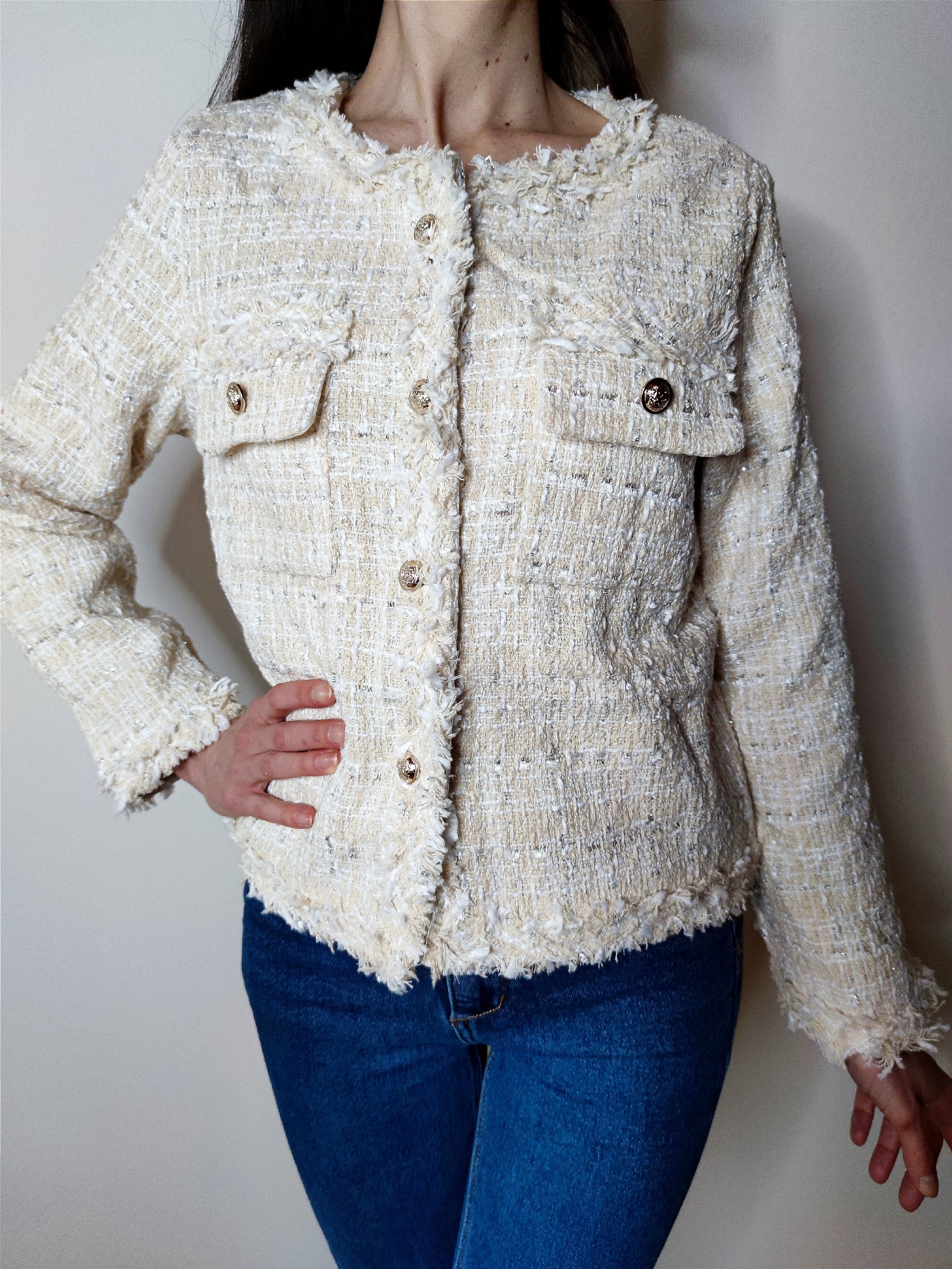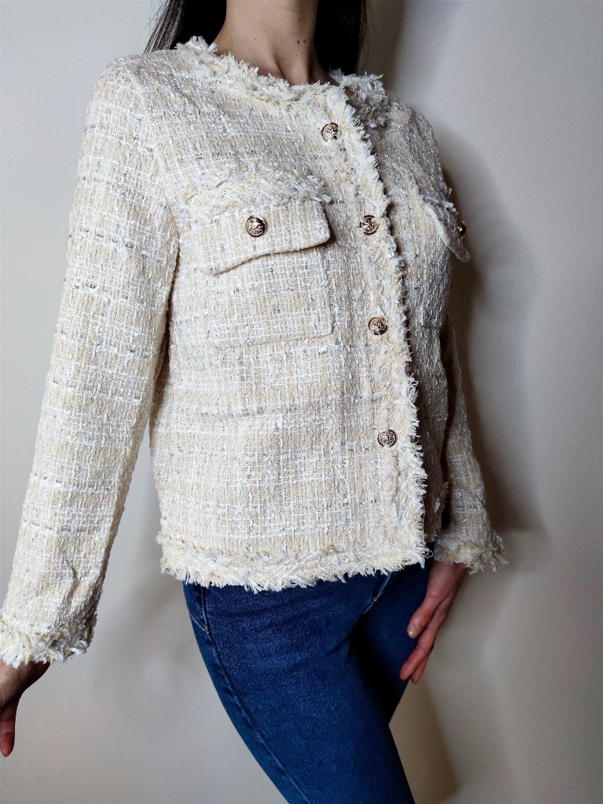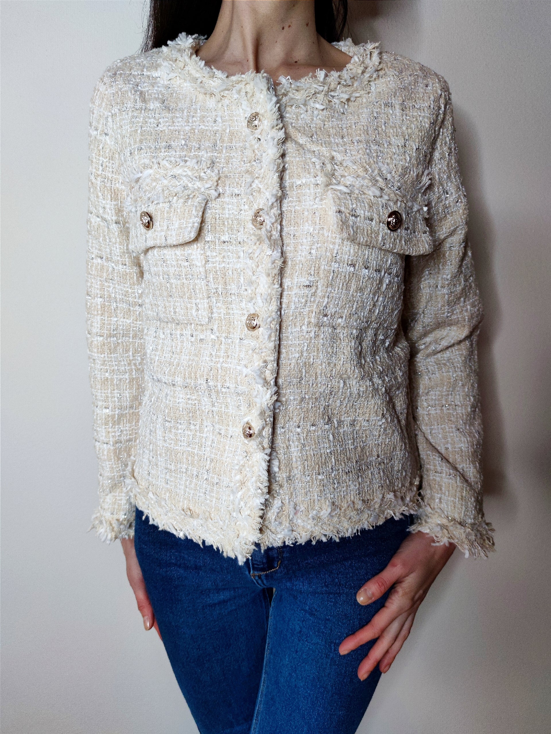 Giacca realizzata in tessuto di qualità, presenta due tasche frontali e chiusura con bottoni gioiello che donano un tocco di stile. Ideale per completare look eleganti o casual grazie alla sua versatilità