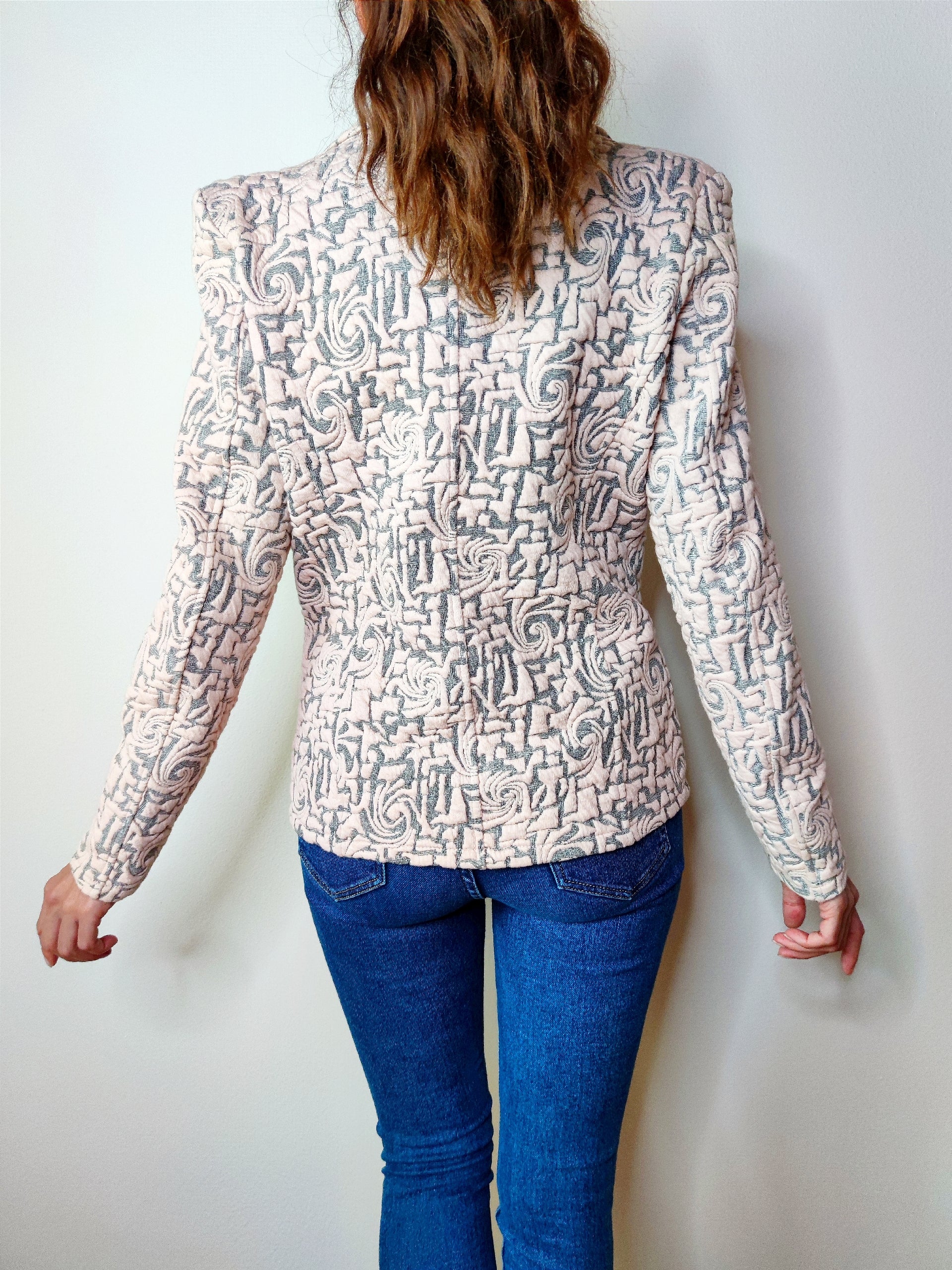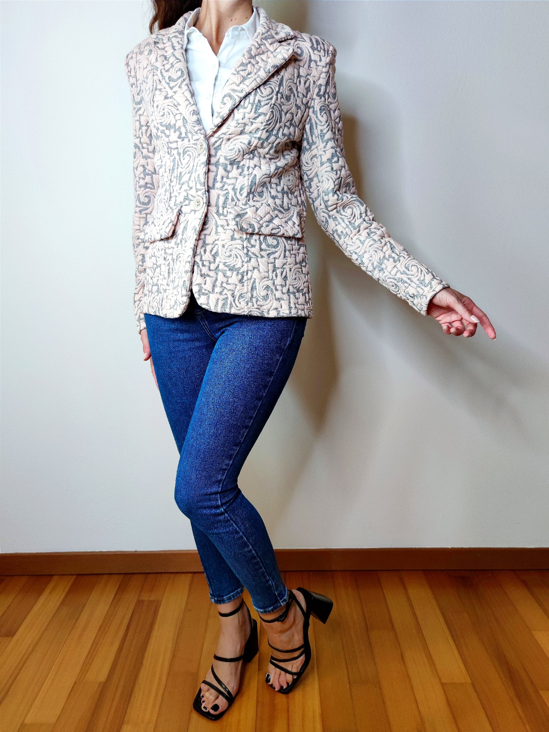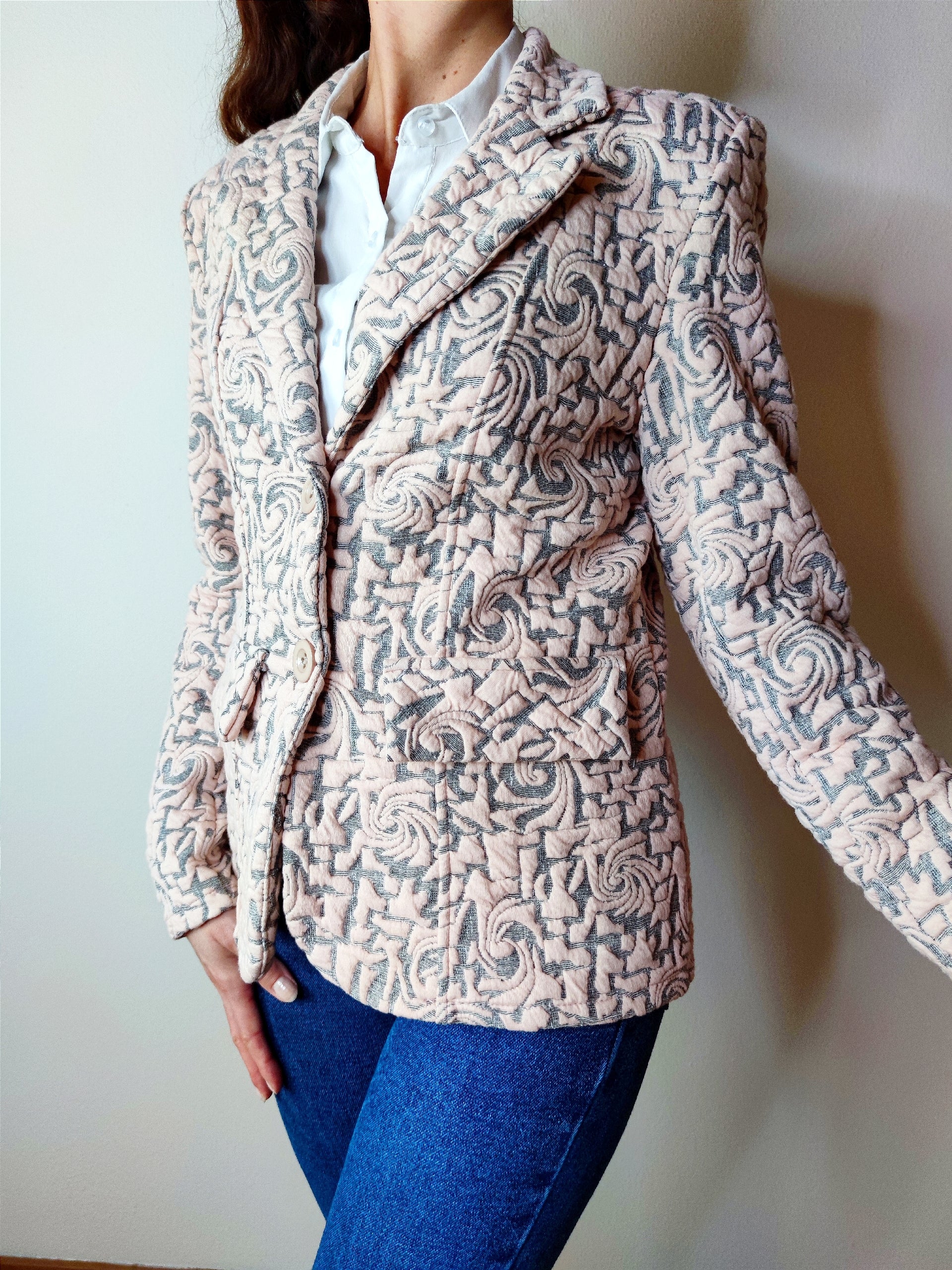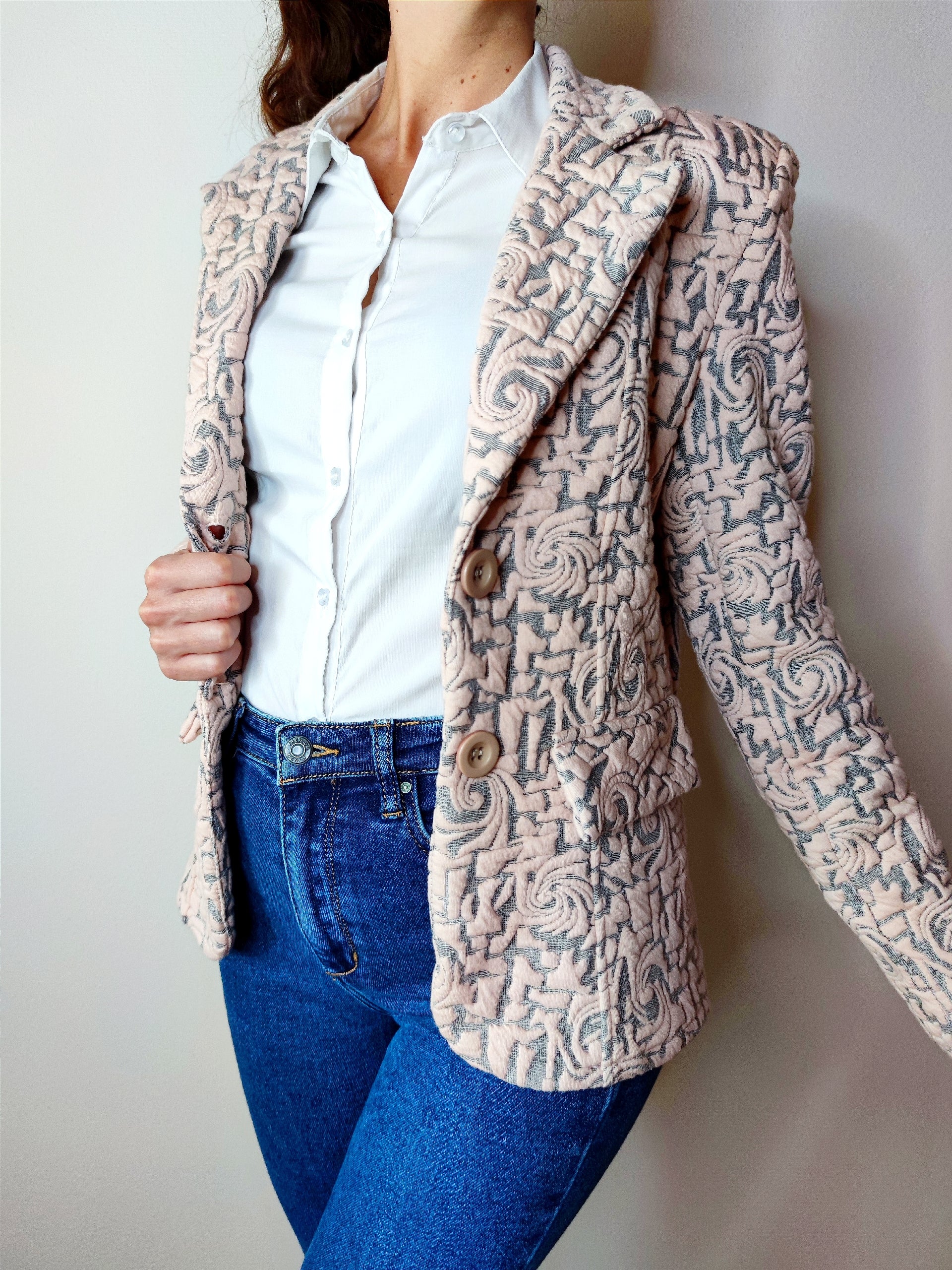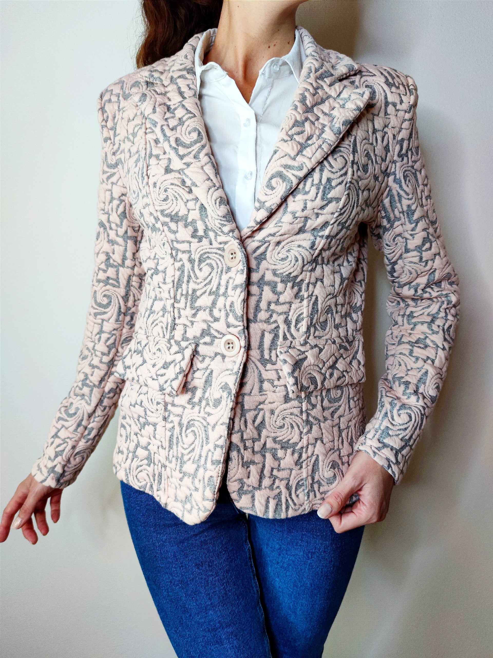 Giacca elegante realizzata in tessuto matelassè di qualità, spalline imbottite, chiusura con due bottoni frontali, presenta patte davanti effetto tasca
