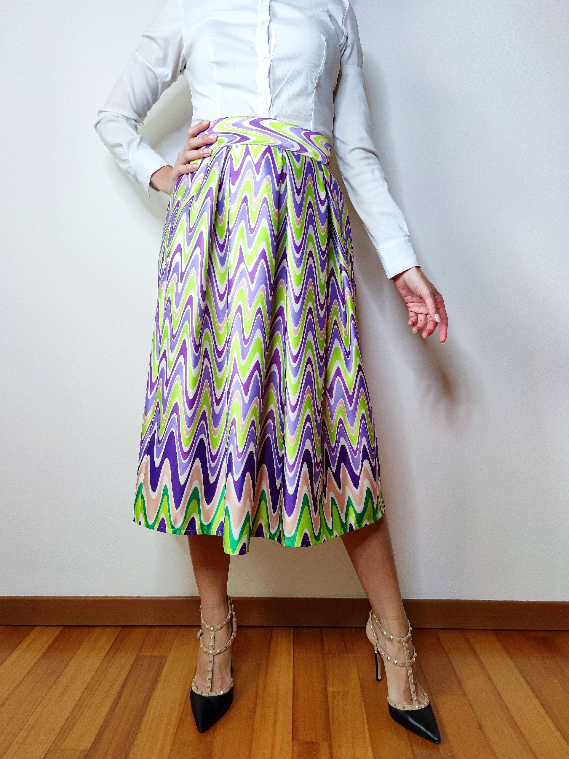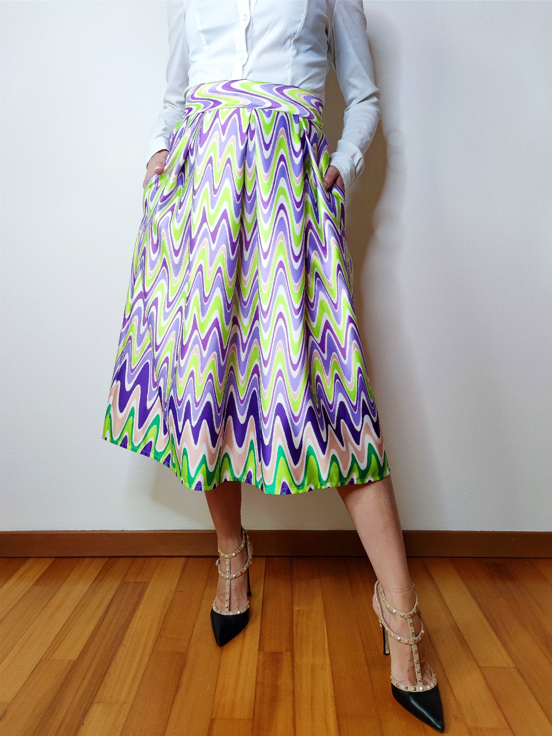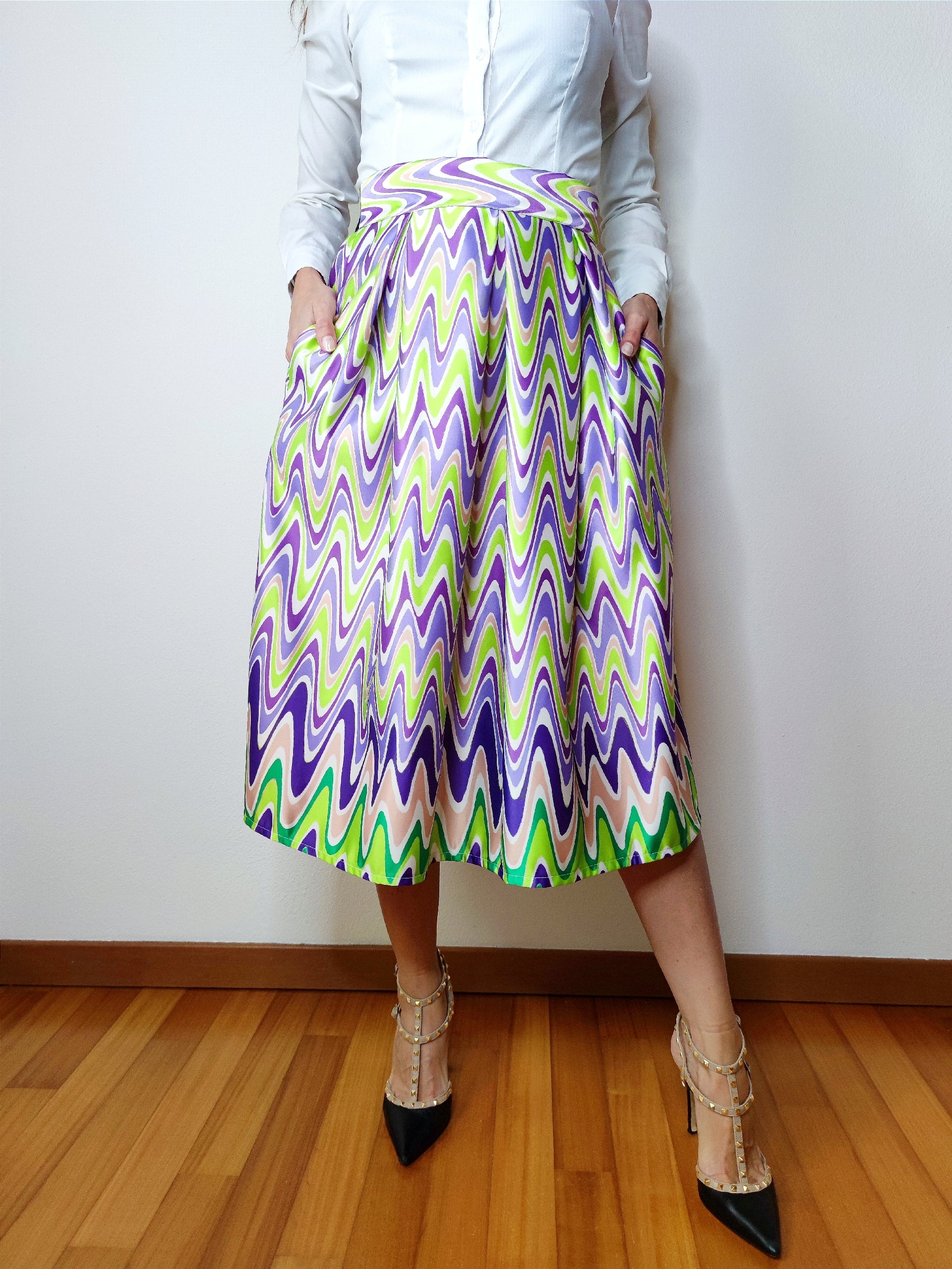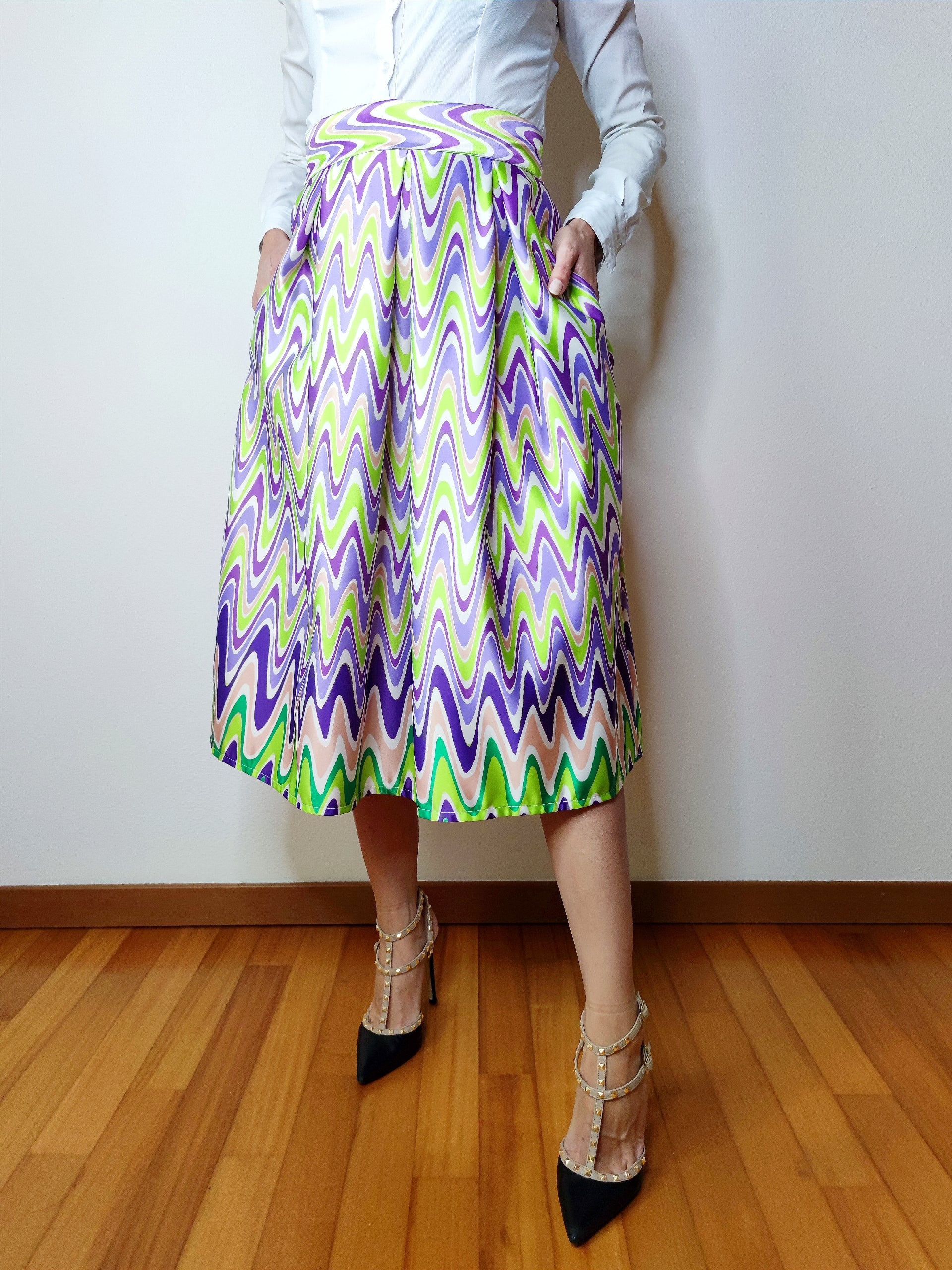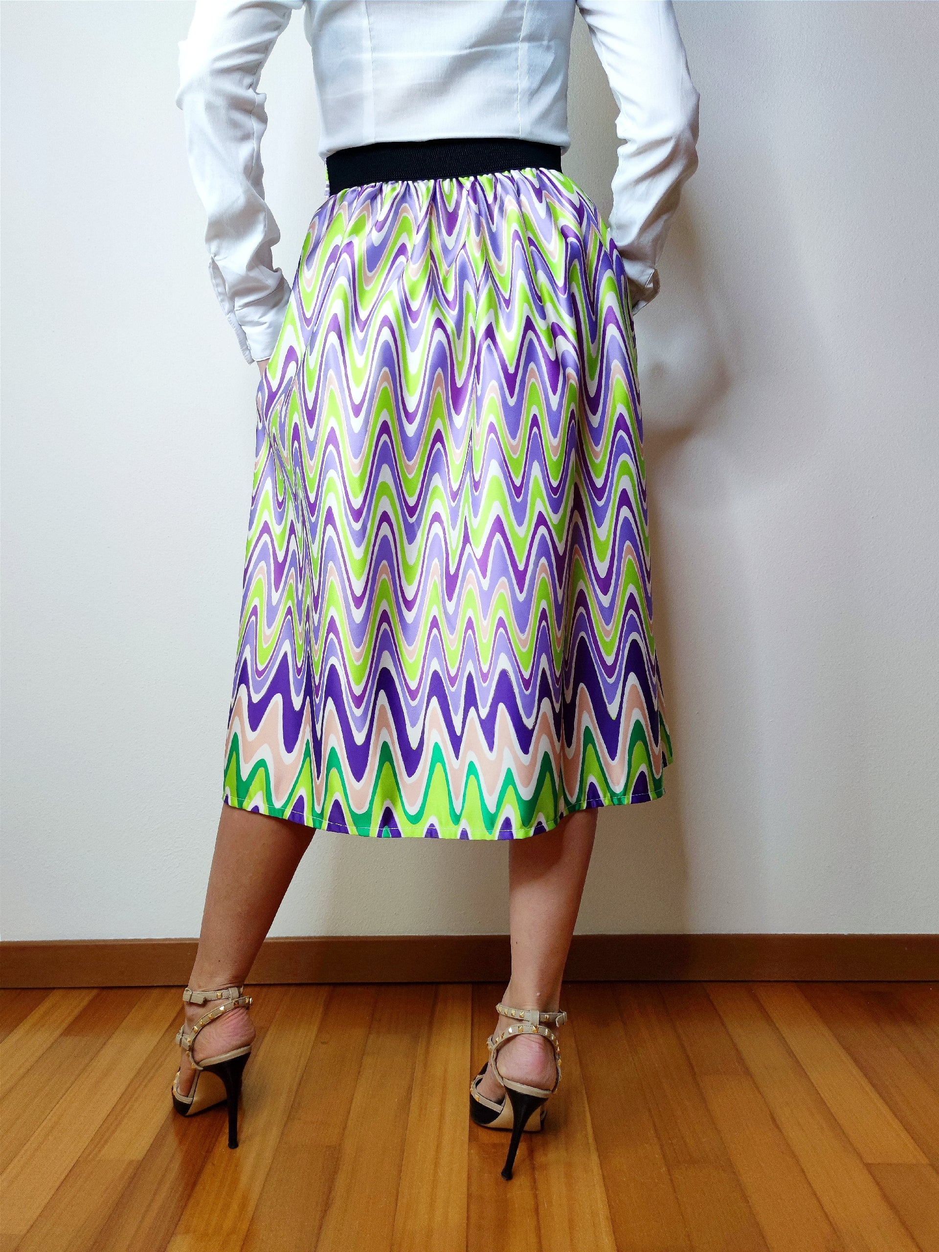 Gonna lunghezza midi realizzata in tessuto di qualità con stampa colorata, presenta tasche laterali a filetto ed elastico in vita per un comfort perfetto