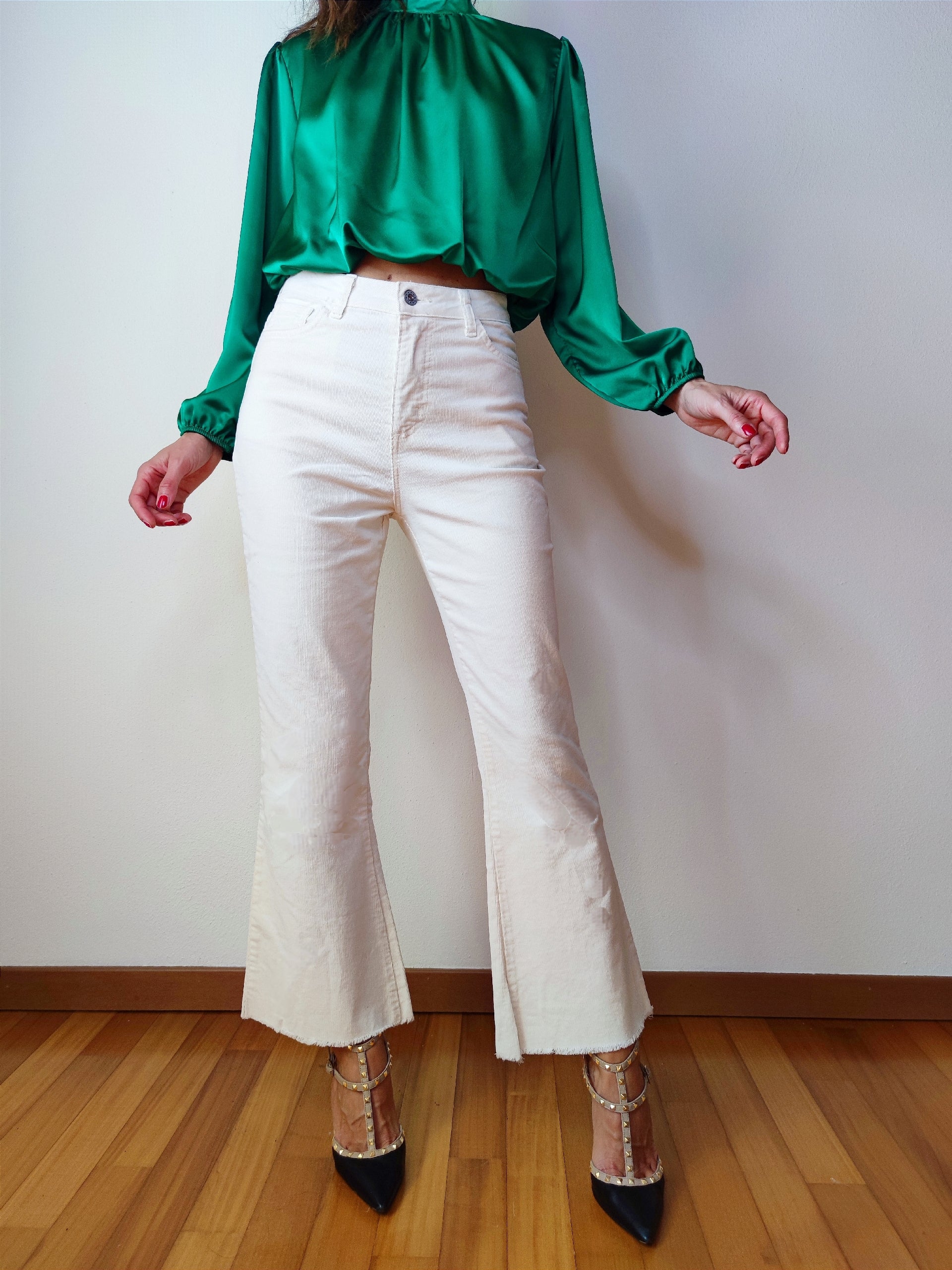 Pantalone a vita alta a zampetta in velluto con tasche, color panna, frangette sul fondo